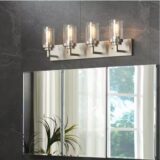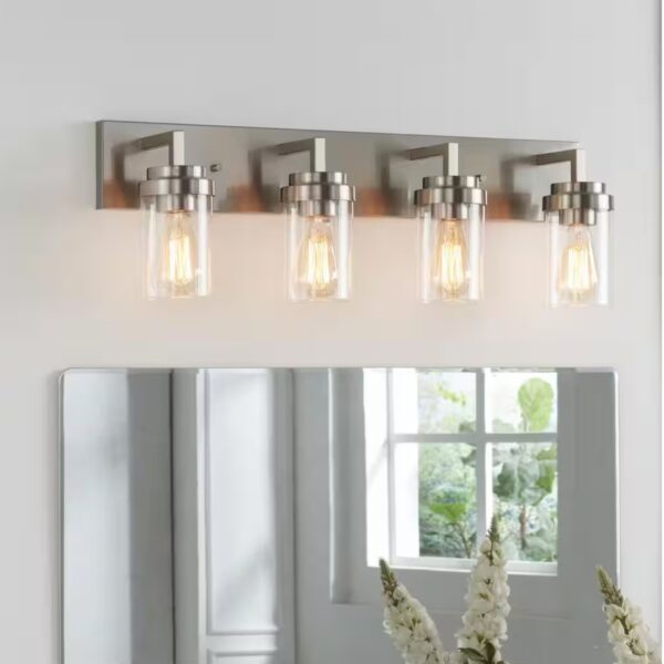 Available in multiple configurations (2-light, 3-light, or 4-light options) and finishes—including black, brushed nickel, and chrome—this piece lets you customize the look to fit your space perfectly. The sturdy iron frame supports transparent glass shades that enhance both the elegance and brightness of the fixture.